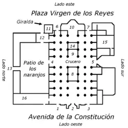 La Giralda, ancien minaret de la mosquée préexistante, exerce la fonction de tour et de campanile ou clocher de la cathédrale. Importante par son histoire, c'est aussi un monument d'une remarquable architecture. Sa base carrée située à 7,12 mètres au-dessus du niveau de la mer, a 13,61 mètres de côté, tandis que sa hauteur est de 104,06 mètres. Elle fut construite à l'image du minaret de la mosquée Koutoubia de Marrakech (au Maroc), bien que l'étage supérieur et le clocher à lanternon qui le surmonte soient de style Renaissance, européen.