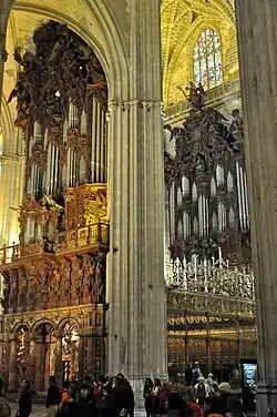 L'histoire des orgues de la cathédrale de Séville remonte à 1479. Elle abritait deux instruments historiques : un orgue Gospel de Jordi Bosch, achevé en 1793, et un orgue de Valentín et José Valentín Verdalonga, achevé en 1831. Aucun des deux n'a survécu au tremblement de terre de 1888. Ils ont été remplacés en 1901-1903 par des orgues jumeaux d'Aquilino Amezua. Ceux-ci ont été convertis à la commande électrique en 1973 et sont maintenant joués à partir d'une console unique à quatre claviers située sur le sol entre les deux orgues. Ceux-ci se trouvent dans la nef centrale (chœur). Ils sont construits en miroir l'un par rapport à l'autre dans deux travées, avec le buffet d'orgue tourné vers la nef centrale et vers les nefs latérales. Leurs buffets baroques sont en bois massif. L'orgue a ensuite été retravaillé par Gerhard Grenzing en 1996, ajoutant des capacités baroques plus traditionnelles à cet instrument romantique et symphonique.