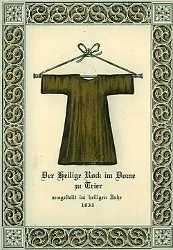 La légende indique qu’Hélène, mère de l'empereur Constantin légua (ou selon une autre tradition en fit don) la Sainte tunique (vêtement inconsutile[3] qu'aurait porté Jésus) à l'évêque de Trèves Agritius (en). La tradition tréviroise de l'existence de cette tunique à Trèves est tardive : elle est évoquée pour la première fois vers 1060 par le biographe de saint Agritius. Un siècle plus tard, le 1er mai 1196, elle est transférée de la chapelle saint Nicolas de la cathédrale dans le nouveau maître-autel du chœur orienté[4].