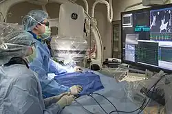 - Quantification des fuites valvulaires : elle peut être faite en faisant la différence entre le débit cardiaque calculé par angiographie ventriculaire gauche (volume d'éjection systolique*fréquence cardiaque) avec le débit mesuré par la méthode de Fick. Cette technique est cependant complexe et imprécise et on se contente, le plus souvent, d'une estimation semi-quantitative par injection d'un produit de contraste dans la racine de l'aorte pour une insuffisance aortique ou dans le ventricule gauche pour une insuffisance mitrale[8].