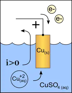 - ↑ Les électro-chimistes rappellent de façon mnémotechnique dans les cas simples qu'il s'agit de la voie (hôdos en grec scientifique, à l'origine du suffixe ode) forcée des cations (préfixe cat, du préfixe grec cata, soit "bas, en bas, en profondeur"). Les électrons nécessaires à la réaction de réduction des cations ou, d'une manière générale, des composés les plus facilement réductibles sont fournis par la cathode. En effet, les électrons tendent en effet à s'y accumuler à cause de la résistance global du mélange électrolysé. Une expression triviale des techniciens de cathode met en lumière cette description: la cathode grouille d'électrons.