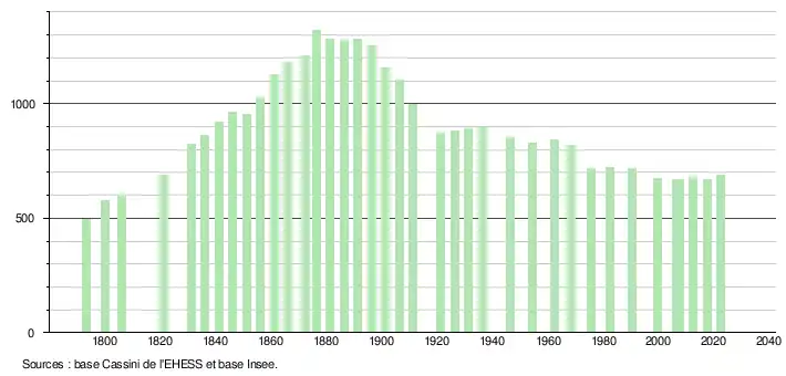 L'évolution du nombre d'habitants est connue à travers les recensements de la population effectués dans la commune depuis 1793. Pour les communes de moins de 10 000 habitants, une enquête de recensement portant sur toute la population est réalisée tous les cinq ans, les populations de référence des années intermédiaires étant quant à elles estimées par interpolation ou extrapolation[17]. Pour la commune, le premier recensement exhaustif entrant dans le cadre du nouveau dispositif a été réalisé en 2007[18].