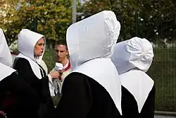 jusqu'au début du XXesiècle elle porte par-dessus la coiffe, le capot noir en période hivernale et le capot gris (blanc à pois noirs) en période estivale;