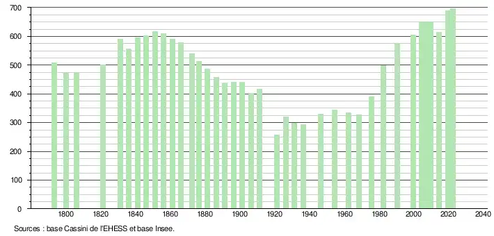 L'évolution du nombre d'habitants est connue à travers les recensements de la population effectués dans la commune depuis 1793. Pour les communes de moins de 10 000 habitants, une enquête de recensement portant sur toute la population est réalisée tous les cinq ans, les populations de référence des années intermédiaires étant quant à elles estimées par interpolation ou extrapolation[21]. Pour la commune, le premier recensement exhaustif entrant dans le cadre du nouveau dispositif a été réalisé en 2004[22].