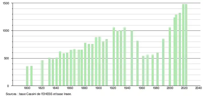 L'évolution du nombre d'habitants est connue à travers les recensements de la population effectués dans la commune depuis 1800. Pour les communes de moins de 10 000 habitants, une enquête de recensement portant sur toute la population est réalisée tous les cinq ans, les populations de référence des années intermédiaires étant quant à elles estimées par interpolation ou extrapolation[6]. Pour la commune, le premier recensement exhaustif entrant dans le cadre du nouveau dispositif a été réalisé en 2008[7].