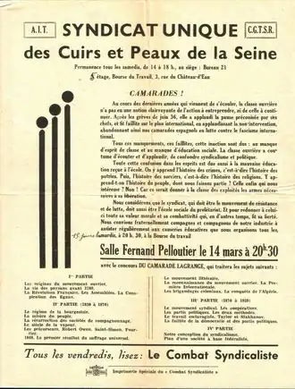Nous considérons que le syndicat, qui doit être le mouvement de résistance et de lutte, doit aussi être l'école sociale du prolétariat. Et pour redonner à celui-ci toute sa valeur morale et sa combattivité qui, en d'autres temps, fit sa fierté. Nous convions fraternellement compagnes et compagnons de notre industrie à assister régulièrement aux causeries éducatives que nous organisons tous les quinze jours, les mardis, à 20 h. 30, à la Bourse du travail.