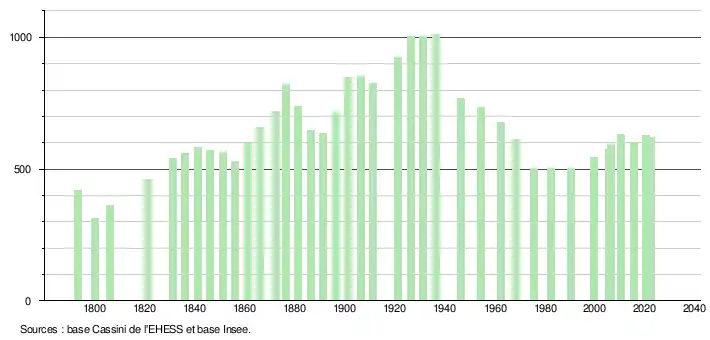 L'évolution du nombre d'habitants est connue à travers les recensements de la population effectués dans la commune depuis 1793. Pour les communes de moins de 10 000 habitants, une enquête de recensement portant sur toute la population est réalisée tous les cinq ans, les populations de référence des années intermédiaires étant quant à elles estimées par interpolation ou extrapolation[19]. Pour la commune, le premier recensement exhaustif entrant dans le cadre du nouveau dispositif a été réalisé en 2005[20].