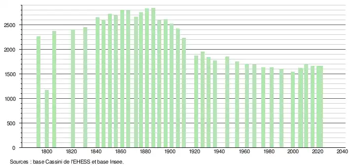 L'évolution du nombre d'habitants est connue à travers les recensements de la population effectués dans la commune depuis 1793. Pour les communes de moins de 10 000 habitants, une enquête de recensement portant sur toute la population est réalisée tous les cinq ans, les populations de référence des années intermédiaires étant quant à elles estimées par interpolation ou extrapolation[28]. Pour la commune, le premier recensement exhaustif entrant dans le cadre du nouveau dispositif a été réalisé en 2005[29].