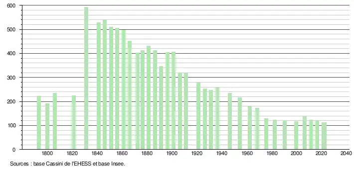 | L'évolution du nombre d'habitants est connue à travers les recensements de la population effectués dans la commune depuis 1793. Pour les communes de moins de 10 000 habitants, une enquête de recensement portant sur toute la population est réalisée tous les cinq ans, les populations de référence des années intermédiaires étant quant à elles estimées par interpolation ou extrapolation[23]. Pour la commune, le premier recensement exhaustif entrant dans le cadre du nouveau dispositif a été réalisé en 2006[24]. En 2022, la commune comptait 112 habitants[Note 4], en évolution de −5,08 % par rapport à 2016 (Gers : +1,04 %, France hors Mayotte : +2,11 %). |
