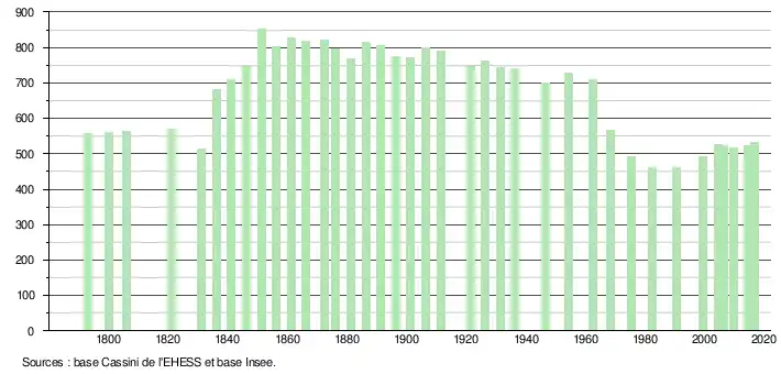 L'évolution du nombre d'habitants est connue à travers les recensements de la population effectués dans la commune depuis 1793. Pour les communes de moins de 10 000 habitants, une enquête de recensement portant sur toute la population est réalisée tous les cinq ans, les populations de référence des années intermédiaires étant quant à elles estimées par interpolation ou extrapolation[8]. Pour la commune, le premier recensement exhaustif entrant dans le cadre du nouveau dispositif a été réalisé en 2004[9].