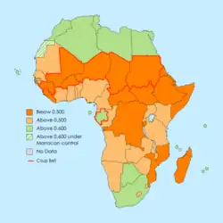 Indice de développement humain des pays d'Afrique. La ceinture de coups d'État est délimitée en rouge. Chaque pays compris dans la ceinture, hormis le Gabon, est défini par un IDH inférieur à 0,5 et font alors partis des pays les moins avancés.