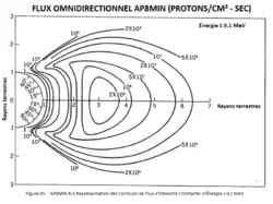 - ↑ Jusqu'à plusieurs centaines de mégaélectron-volts (MeV) à des débits de fluence de plusieurs dizaines de milliers de protons par centimètre carré et par seconde dans les zones les plus intenses.