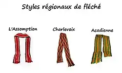 La plupart des ceintures anciennes, dites métis, ont été tissées sur métier, bien souvent en Angleterre, pour imiter les ceintures tissées aux doigts du Bas Canada. Bien des musées qui exposent ces ceintures omettent de mentionner ce fait. De nos jours, les ceintures fléchées, dont les styles et couleurs varient selon les artisans qui les confectionnent, servent aussi parfois à identifier l'origine du porteur. Par exemple, la ceinture de la région de Québec met la flèche nette et le bleu en valeur ; celle de Montréal est plus rouge ; et celle de l'Ouest (historiquement entre Ottawa et la région de la rivière rouge) arbore le noir pour se distinguer, alors qu'autrefois on pouvait retrouver les ceintures fléchées sur tout le territoire du Bas Canada et là où les voyageurs la transportaient pour les échanger contre des fourrures.