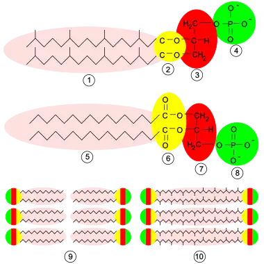 En haut : membrane archéenne ; 1 chaîne latérale terpénoïde ; 2 liaison éther ; 3 L-glycérol ; 4 groupe phosphate. Au milieu : membrane archéenne et bactérienne ; 5 acide gras ; 6 liaison ester ; 7 D-glycérol ; 8 groupe phosphate. En bas : 9 bicouche lipidique chez les eucaryotes, les bactéries et la plupart des archées ; 10 monocouche lipidique chez certaines archées.