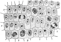 b. noyaux se préparant à la division ;