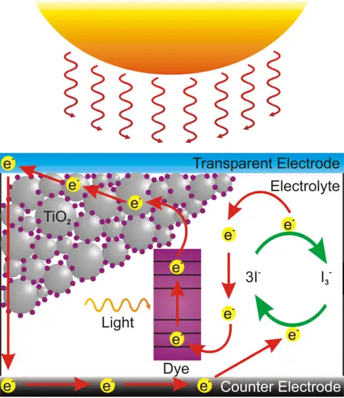 Lorsqu'un pigment est exposé à la lumière, il peut absorber un photon ce qui va l'exciter. Ceci génère un électron avec une énergie suffisante pour être injecté dans la bande de conduction du semi-conducteur[A 1]. Cet électron va ensuite rejoindre le circuit électrique par l'intermédiaire de l'électrode et constitue l'énergie électrique produite par la cellule. Le pigment ayant perdu un électron va récupérer un électron par le biais de l'électrolyte qui est lui-même régénéré à la cathode[A 1].