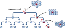 [11] Ces deux modèles ne sont pas mutuellement exclusifs, car les cellules souches cancéreuses elles-mêmes subissent une évolution clonale. Ainsi, d’autres cellules souches cancéreuses peuvent émerger si une mutation leur confère des propriétés plus agressives[12] (Fig. 5).