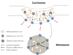Les cellules tumorales soumises à une transition épithélio-mésenchymateuse peuvent être des précurseurs de cellules cancéreuses métastatiques, voire de CSCs métastatiques[84]. Dans la bordure invasive du carcinome pancréatique, un sous-ensemble de cellules CD133+CXCR4+ (récepteur de la chimiokine CXCL12 également connu sous le nom de ligand SDF1) a été défini. Ces cellules présentaient une activité migratoire nettement plus forte que leurs homologues CD133+CXCR4, mais toutes deux avaient une capacité de développement tumoral similaire[85]. De plus, l'inhibition du récepteur CXCR4 a réduit le potentiel métastatique sans altérer la capacité tumorigène[86].