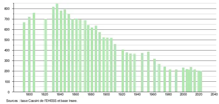 prairies (41,8%), terres arables (33,3%), forêts (22,2%), zones urbanisées (2,7%)[12]. L'évolution de l’occupation des sols de la commune et de ses infrastructures peut être observée sur les différentes représentations cartographiques du territoire: la carte de Cassini (XVIIIesiècle), la carte d'état-major (1820-1866) et les cartes ou photos aériennes de l'IGN pour la période actuelle (1950 à aujourd'hui)[Carte 1].