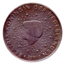 L'effigie stylisée de Beatrix (1938- ), Reine des Pays-Bas, tournée vers la gauche et entourée de points et des 12 étoiles du drapeau européen. Le pourtour reprend la légende BEATRIX KONINGIN DER NEDERLANDEN (Beatrix Reine des Pays-Bas), complétée en bas par le millésime. | |