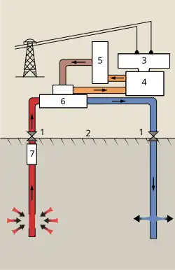 1:têtes de puits 2:surface du sol 3:générateur 4:turbine 5:condenseur 6:séparateur