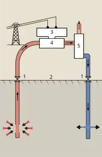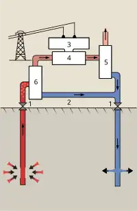 EGS (Enhanced geothermal system - Système géothermique avancé): 1:Réservoir 2:Local pompes 3:Échangeur de chaleur 4:Salle des machines 5:Puits de production 6:Puits d'injection 7:Eau chaude envoyée au chauffage urbain 8:Sédiments poreux 9:Puits d'observation 10:Socle rocheux cristallin.