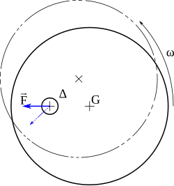 Par ailleurs, lors de la rotation, si le centre d'inertie n'est pas sur l'axe, cela signifie que l'axe doit exercer une force sur le disque pour créer une accélération centrale centripète. Cette force tournant avec l'objet, cela crée des vibrations. Ces vibrations peuvent être créées volontairement, par exemple pour les vibreurs, ou bien être involontaires, auquel cas elles sont nuisibles : elles provoquent des bruits, de l'usure prématurée, le desserrage d'éléments vissés, un phénomène de fatigue pouvant amener à la rupture de l'axe, …