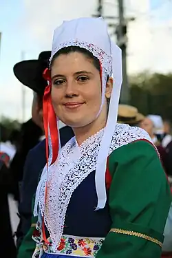 Les hommes portent, selon les circonstances, un costume de la fin du XIXe siècle, resté inchangé au cours du XXe siècle, avec des vestes violines sur des gilets verts ou des vestes bleues sur des gilets noirs avec une profusion de broderies et de boutons en métal, en os ou en nacre avec le grand chapeau à rubans, de velours noir.
