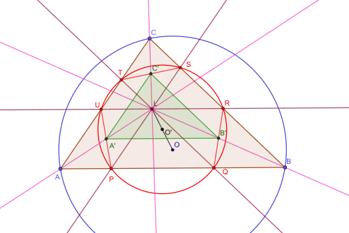Les droites (RQ), (ST) et (PU) sont antiparallèles aux côtés d'un triangle. Les segments sont de même longueur et leurs milieux A’, B’ et C’ situés sur les symédianes forment un triangle A’B’C’ homothétique de ABC dans une homothétie de centre L.