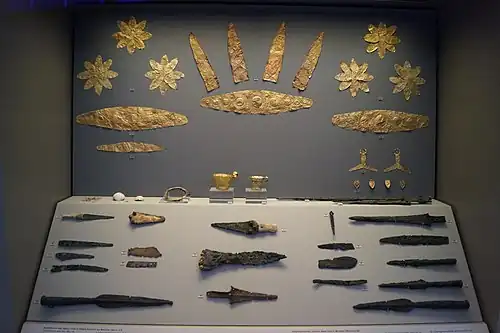 De nombreux couteaux, épées et outils en bronze ont été trouvés dans les objets funéraires à gauche et à droite des morts. Trois couteaux de bronze étaient incrustés d'or et d'argent. Plusieurs coupes et vases en or ont été trouvés, et des vases en cuivre à leur pied.