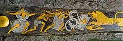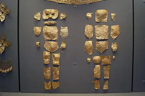 À noter une boîte hexagonale en bois, dont six feuilles d'or ont été conservées, attachées à la boîte. Deux sont décorées de motifs en spirale, deux autres montrent un lion chassant une antilope et les deux derniers montrent un lion chassant un cerf[36].