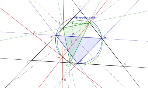 Soit ABC un triangle, on note O son centre du cercle circonscrit, et P un point du plan, A'B'C' le triangle médian de ABC, et XYZ le triangle podaire de P par rapport à ABC. On note D, E, F les intersections des côtés (éventuellement prolongés) de A'B'C' et XYZ (e.g., D est l'intersection de (B'C') et (YZ), etc.), alors les droites (XD), (YE) et (ZF) sont concourantes en un point M commun aux cercles circonscrits à A'B'C' (qui est donc le cercle d'Euler de ABC) et XYZ.
