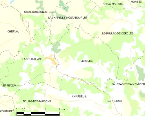 En 2016, année précédant la création de la commune nouvelle de La Tour-Blanche-Cercles, Cercles était limitrophe de six autres communes. À l'est, le territoire de Paussac-et-Saint-Vivien était distant d'environ 600 mètres.
