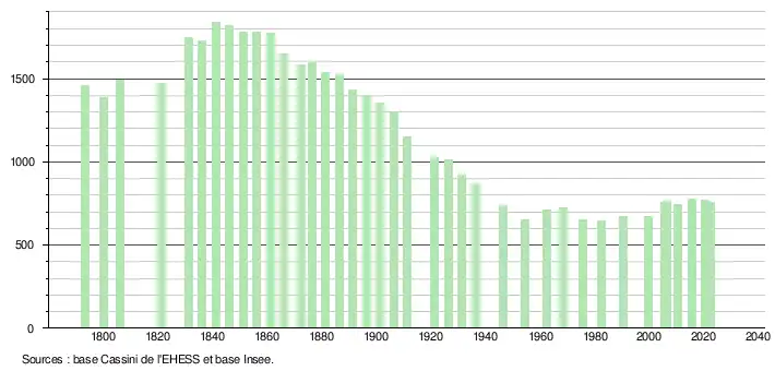L'évolution du nombre d'habitants est connue à travers les recensements de la population effectués dans la commune depuis 1793. Pour les communes de moins de 10 000 habitants, une enquête de recensement portant sur toute la population est réalisée tous les cinq ans, les populations de référence des années intermédiaires étant quant à elles estimées par interpolation ou extrapolation[20]. Pour la commune, le premier recensement exhaustif entrant dans le cadre du nouveau dispositif a été réalisé en 2005[21].