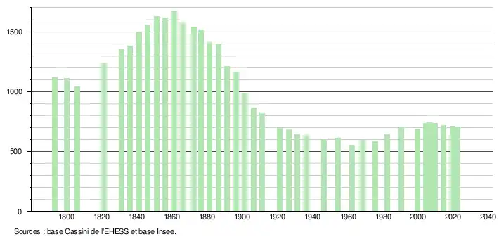L'évolution du nombre d'habitants est connue à travers les recensements de la population effectués dans la commune depuis 1793. Pour les communes de moins de 10 000 habitants, une enquête de recensement portant sur toute la population est réalisée tous les cinq ans, les populations de référence des années intermédiaires étant quant à elles estimées par interpolation ou extrapolation[47]. Pour la commune, le premier recensement exhaustif entrant dans le cadre du nouveau dispositif a été réalisé en 2004[48].
