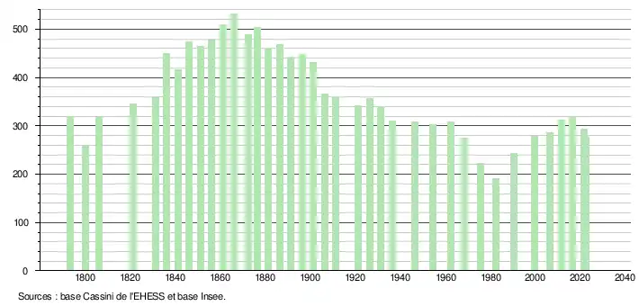 L'évolution du nombre d'habitants est connue à travers les recensements de la population effectués dans la commune depuis 1793. Pour les communes de moins de 10 000 habitants, une enquête de recensement portant sur toute la population est réalisée tous les cinq ans, les populations de référence des années intermédiaires étant quant à elles estimées par interpolation ou extrapolation[35]. Pour la commune, le premier recensement exhaustif entrant dans le cadre du nouveau dispositif a été réalisé en 2006[36].