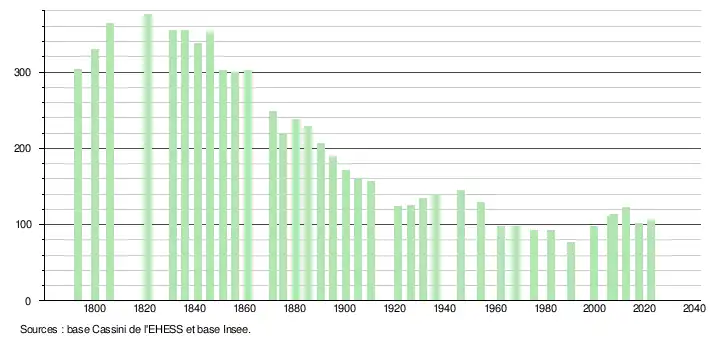 L'évolution du nombre d'habitants est connue à travers les recensements de la population effectués dans la commune depuis 1793. Pour les communes de moins de 10 000 habitants, une enquête de recensement portant sur toute la population est réalisée tous les cinq ans, les populations de référence des années intermédiaires étant quant à elles estimées par interpolation ou extrapolation[21]. Pour la commune, le premier recensement exhaustif entrant dans le cadre du nouveau dispositif a été réalisé en 2007[22].