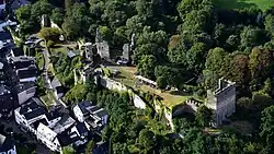 Les murs sont en grauwacke et en ardoise, les arcs en tuf volcanique. Des 4 niveaux, celui le plus bas comprend 2 salles avec des voûtes en berceau. Les bâtisses du château s'étendent à partir du donjon vers l'ouest sur une longueur de 200 m environ, dont une bonne moitié est occupé par le château principal.