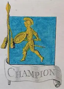 D'azur à un homme courant, armé et cuirassé de toutes pièces d'or, tenant une épée et un bouclier du même.