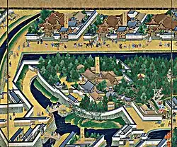 Le château d'Edo, entouré de palais résidentiels et de douves, d'après un paravent du XVIIe siècle. | |
