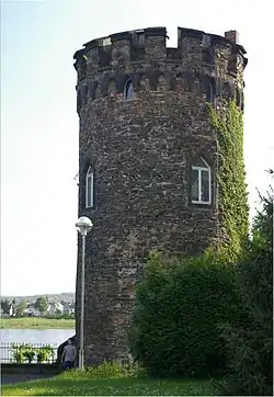 L'archevêque de Trèves Cunon de Falkenstein acquit la ville d'Engers en 1371 et construisit le château de Kunostein sur les rives du Rhin. Son frère et successeur Werner de Falkenstein a déplacé le poste de douane du château de Stolzenfels près de Coblence à Engers. Le château de Kunostein devient ainsi un château douanier (de). Il survit au Moyen Âge sans subir de destructions majeures. En 1757, Jean-Philippe de Walderdorff, alors archevêque et électeur de Trèves, décide de moderniser le château. Ce projet est interprété comme une réaction à la fondation de la ville de Neuwied. Il change ses plans et fait démolir le château en 1758. Aujourd'hui, la Tour Grise de l'ancien poste de douane est encore conservée[1].