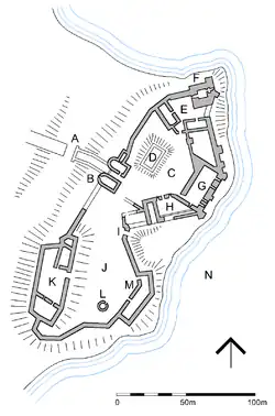 Au sud de la tour se trouve une série de salles édifiées contre l'épais mur-rideau du XIVe siècle servant de contrefort[42]. La grande salle est au centre de ces bâtiments, jouxtée au nord par les appartements privés du seigneur et les cuisines au sud[42]. Un monticule rocheux situé au centre de la basse-cour est surmonté par les fondations d'un bâtiment rectangulaire, vraisemblablement une chapelle[43].