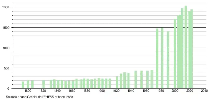 L'évolution du nombre d'habitants est connue à travers les recensements de la population effectués dans la commune depuis 1793. Pour les communes de moins de 10 000 habitants, une enquête de recensement portant sur toute la population est réalisée tous les cinq ans, les populations de référence des années intermédiaires étant quant à elles estimées par interpolation ou extrapolation[31]. Pour la commune, le premier recensement exhaustif entrant dans le cadre du nouveau dispositif a été réalisé en 2004[32].