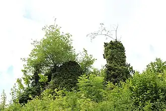 Les ruines de la tour apparaissent à droite dans la végétation. | |||