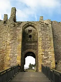 Le château s'élève sur un affleurement rocheux naturel et s'organise autour d'une cour intérieure mesurant environ 40 mètres sur 27 et bordée de bâtiments au sud et à l'est. De ces derniers ne subsistent que les appartements des Ruthven, le corps de garde, le donjon des de Vaux au sud, et les fondations de l'aile sud. Des ruines du mur d'enceinte encadrent la cour au nord et à l'ouest, qui était autrefois divisée en deux par un bâtiment du XVIe siècle. L'accès au château s'effectuait à l'origine par le sud, via un pont et un pont-levis de 3,4 m qui traversaient une douve de 15 m de large. Au XVIe siècle, un escalier fut construit pour accéder aux appartements des Ruthven par l'ouest[5].