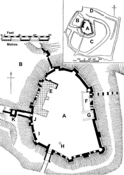 Le mur d'enceinte se trouve au sud de la cour intérieure, elle-même entourée d'un mur. À l'origine, il était surmonté d'une palissade en bois et de fortifications de terre, seules ces dernières survécurent. Ce mur d'enceinte pouvait se franchir par une porte située côté est et, à l'intérieur se trouvait une rangée de bâtiments dont probablement une chambre de sergent, une autre pour les chevaliers, la grande écurie, des granges et un grenier. Aujourd'hui, les visiteurs entrent au château en franchissant le mur d'enceinte par le côté sud, c'est à cet endroit que se trouve aussi l'actuel parc de stationnement du château.