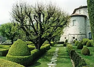Au sud s’étend une vaste terrasse plantée de tilleuls centenaires, ombrageant une pelouse ornée de massifs taillés en motifs circulaires. Le tout est bordé d’un parapet dont les angles forment deux balcons et une échauguette surplombant le Riou coulant 100 m au-dessous. Cette terrasse s’appuie sur une immense cave voûtée, soutenue par de massifs piliers, qui abrite une profonde citerne. Un escalier à double révolution conduit à une terrasse inférieure, maintenue par des arcs soutenus par de puissants contreforts. Il ne reste que deux tours datables de l’ancien système défensif l’une carrée à l’angle est de la terrasse supérieure, l’autre avec sa barbacane.