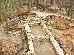 Le château fort comprend la première enceinte, perchée à 241 m d'altitude, et une basse-cour. La première enceinte occupe un plateau ovale de 45 × 80 m. Derrière ses remparts épais de 1,60 m, elle abritait divers corps de logis, des ateliers et le grand puits. Dans une pièce de 10 × 8,50 m, les fouilles ont mis au jour un hypocauste. Légèrement en contrebas de la première enceinte, on voit un donjon de 32 × 8 m avec ses oubliettes.