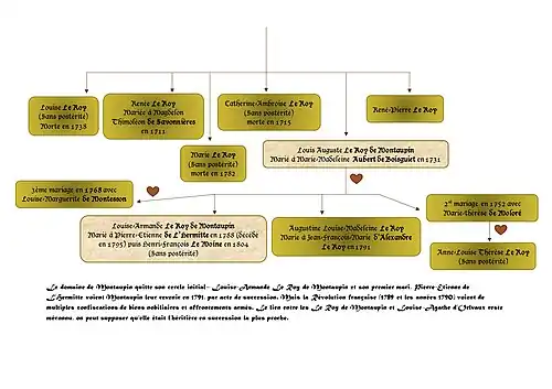 Le 19 juillet 1791, Louise-Armande Le Roy de Montaupin et son époux Pierre-Étienne de L'Hermitte obtinrent, par acte notarial de succession, les deux tiers de l'héritage. Cet acte fut rédigé devant René-Julien Le Blaye et Julien Dioré, notaires à Oizé et à Sougé-le-Ganelon. Ils reçurent pour leur part le lieu et domaine de Montaupin, les bordages de la Teisserie, de Verreille, et de la Place. Ils héritèrent également des métairies Grassin, de la Roche et de Beaumont, des closeries de la Clérissière et de la Foucherie, ainsi que des moulins de Mocque-Souris et de Boisard. Enfin, ils reçurent entre quatre-vingts et cent journaux de sapinières ou bois taillis à la Verrie, ainsi qu’un pécule financier sous forme de rentes.