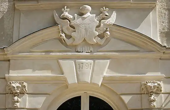 L’écu est de forme des Dames, avec un fond gueules et des rebattements losangés. Il présente un griffon comme meuble. |